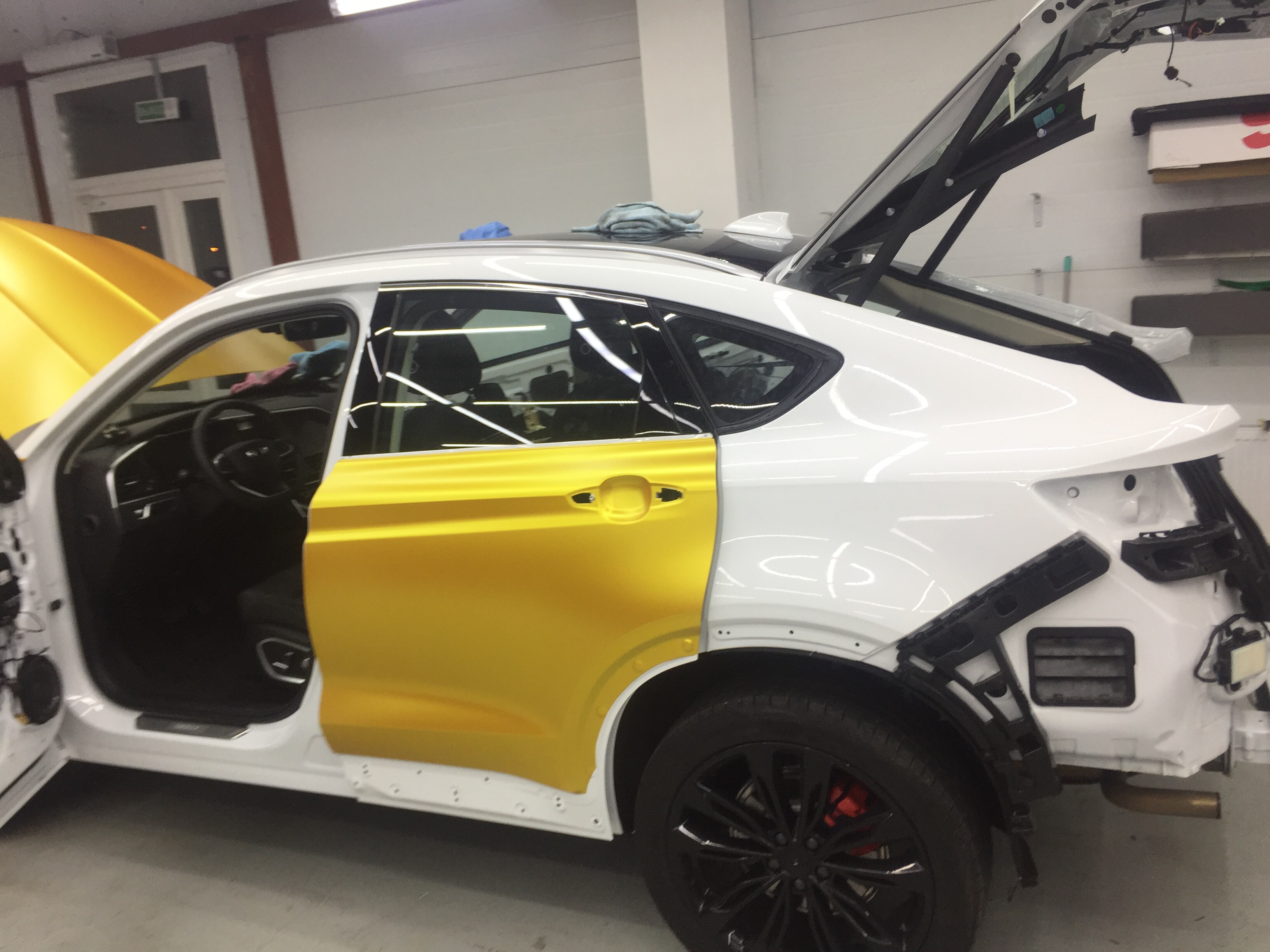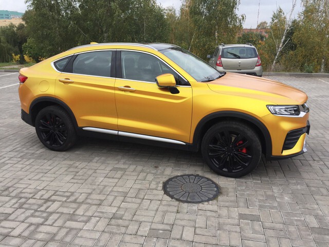 Оклейка Geely Tugella в золотую матовую виниловую пленку в Минске. Оклейка кузова целиком в виниловую цветную пленку. Смена цвета пленкой. Широкий ассортимент цветов и оттенков.